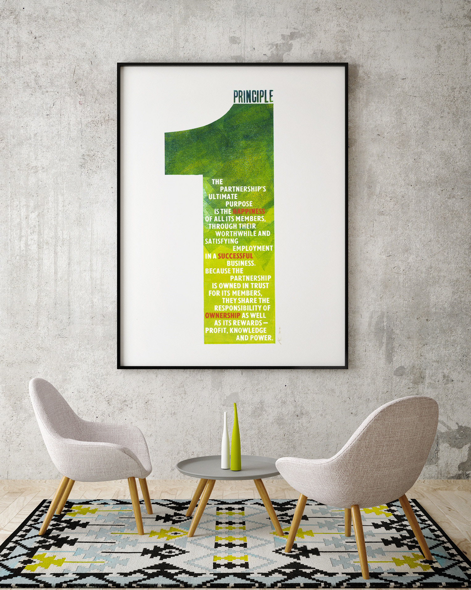 Typographic poster illustrating the first core value of the John Lewis Partnership and displayed in every Waitrose and John Lewis shop and office worldwide. Commission of renowned artist Alan Kitchin and reproduced by screen printers Advanced Graphics London